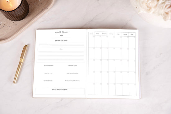 This is the heart of The Flow Agenda and the section you’ll use most. Each week, you’ll plan your time with intention using layouts for time-blocking, setting 3–4 key goals for the week, and tracking your daily routines. You’ll also choose a simple weekly intention across the four life-categories (personal growth, family, career, and relationships) to help you stay balanced without the pressure . It’s your anchor - keeping your goals clear and your days purposeful.